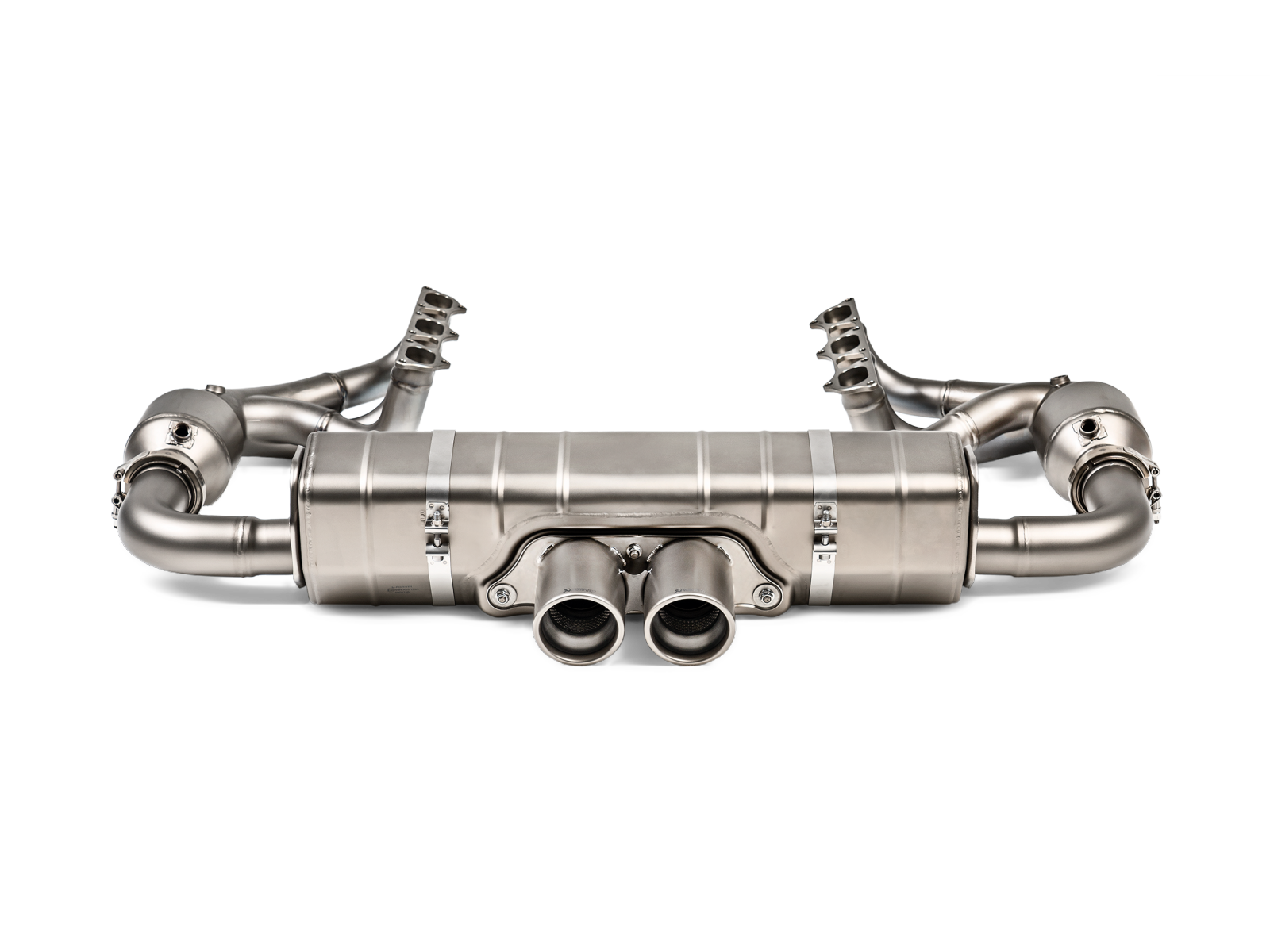 Evolution Race Header Set converts the slip-on system into a full system, built for the track and gives the Porsche GT3 the extra performance to match. Handcrafted titanium headers incorporate 100 cpsi sports catalytic convertors and titanium flanges—cast in Akrapovič’s own foundry. The system offers a perfect power curve right from 3,000 rpm to the very top of the power band, designed to continually increase performance as the revs rise. Along with improved torque and the maximum weight savings to enhance handling, adding the Evolution Race Header (Set) will have the car performing like a true cup racer—with a deep, loud, and powerful Akrapovič racing sound to match its performance.