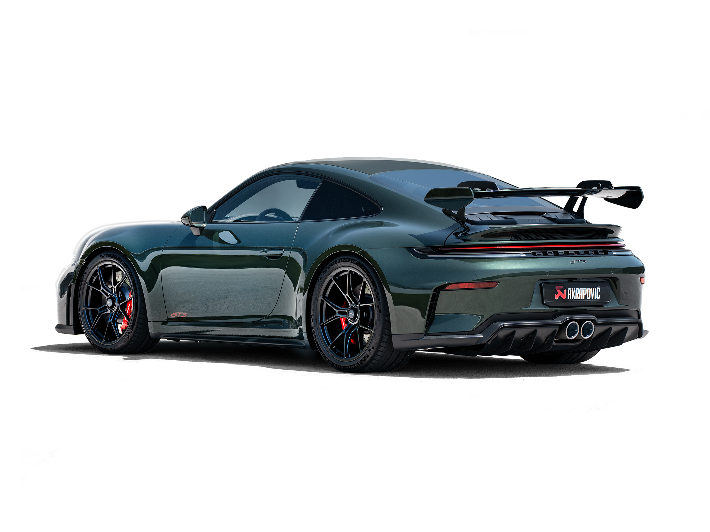 Developed solely for the 911 GT3 (992.2), this high-grade lightweight titanium system is sandblasted and coated for durability. The completely new design includes twin tailpipes, with the outer shell coated and the inner sleeve featuring six imprints to match the six-cylinder engine, with an engraved Akrapovič logo to complete the visual effect. The housing of the exhaust valves – which have been tailored perfectly to the gas flow to produce a smooth, rich tone at normal cruising and a sporty sound experience at higher revs – and the collectors in the muffler are cast in the Akrapovič in-house foundry. When combining the Slip-On Race Line (Titanium) with the Slip-On Race Line Adapter (SS), the weight is decreased by 20.7% (3.5 kg) against the standard system and performance sees an increase of 12.8 kW (17.4 hp) in power at 4650 rpm and a torque rise of 28.7 Nm at 4100 rpm when tested on the Akrapovič dyno against a Porsche 911 GT3 (992.2) with a standard stock exhaust. This system is intended for use on closed-course competition circuits only because it is a racetrack-oriented part. No remapping of the ECU is required.
