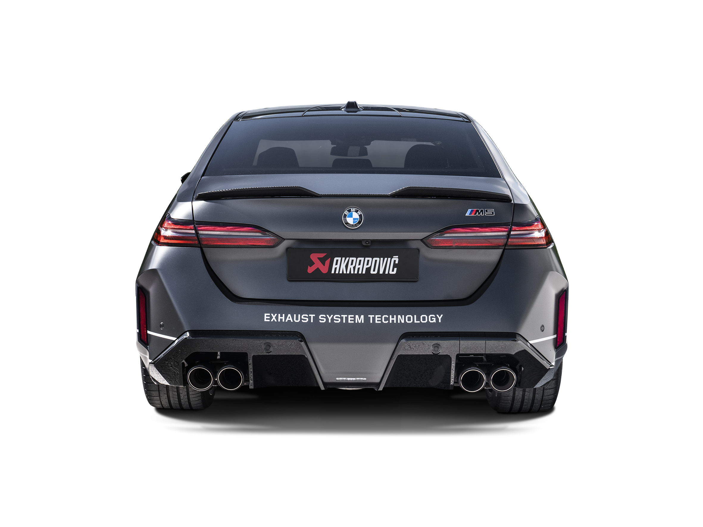This set is constructed from race-proven materials, such as lightweight titanium, and it features a hand-made carbon-fibre outer sleeve. It has a classic cylindrical design, similar to the cylindrical tailpipes of the Akrapovič exhausts for various BMW M models, with a fresh new look for the BMW M5. The tailpipes come with integrated acoustic reflectors, which reflect part of the external sound toward the cabin and enhance the overall acoustic experience of an Akrapovič exhaust system.