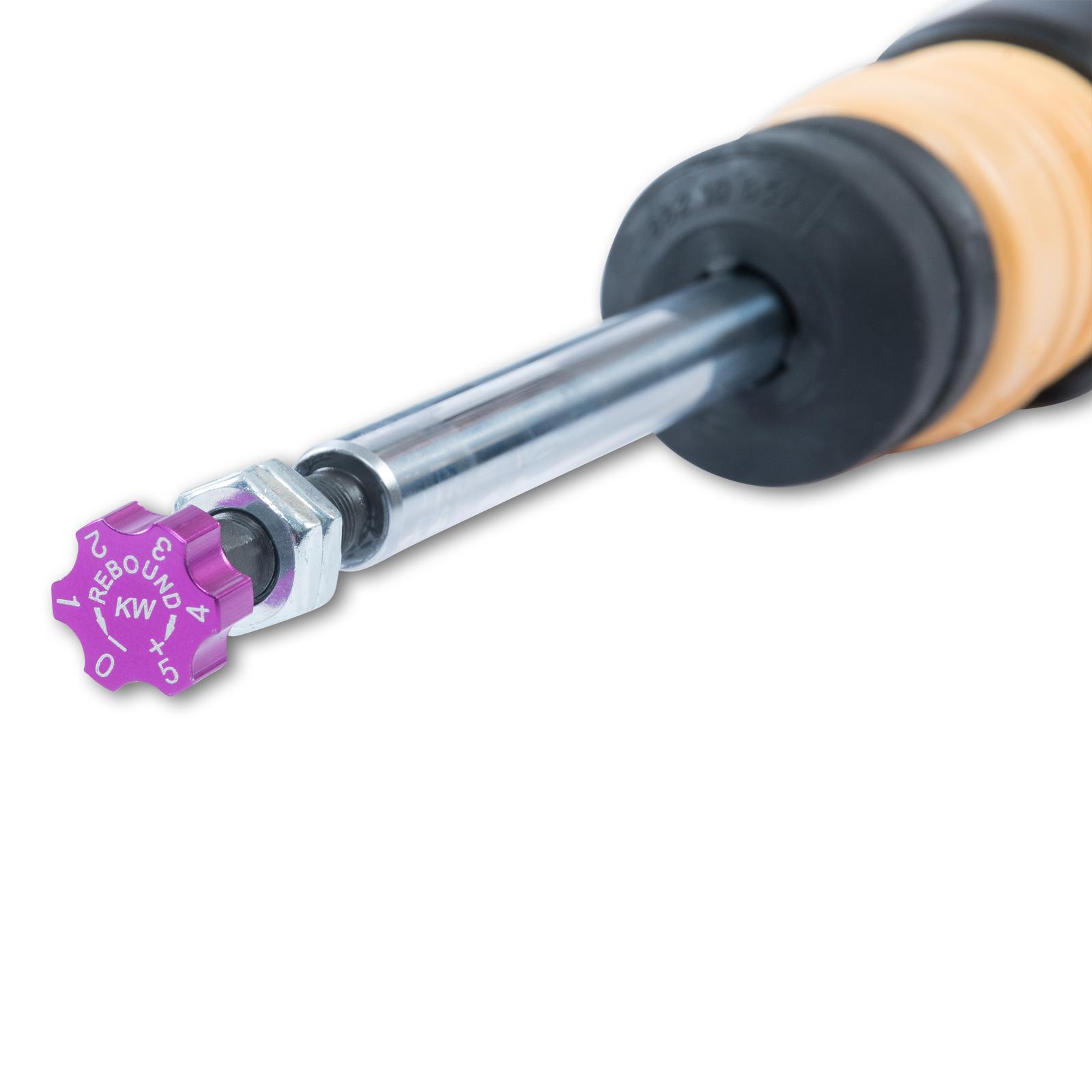 Auch beim KW V2 Comfort Gewindefahrwerk können Sie durch die individuell einstellbare Zugstufenabstimmung selbst Einfluss auf das Handling und den Komfort nehmen. Durch die 16 exakten Klicks können Sie die KW Dämpfer weiter in ihrer Abstimmung auf Wunsch komfortabler oder straffer einstellen, ohne dabei das Bodenventil der Druckstufe zu beeinflussen. Indem Sie über das Einstellrädchen die Zugkraft erhöhen, verringern sich die Aufbaubewegungen an der Karosserie. Ihr Auto fährt sich dadurch spurtreuer und Sie haben bei erhöhten Kurvengeschwindigkeiten noch mehr Stabilität. Wechseln Sie beispielsweise von den freigegebenen Rad/Reifenkombinationen Ihres Automobilherstellers zu größeren Felgen, können Sie mit der einstellbaren Zugstufe das Fahrverhalten Ihres Autos und Ihre neuen Leichtmetallräder perfekt aufeinander anpassen. Oder Sie reduzieren die Zugkraft mit wenigen Klicks auf noch mehr Komfort – ganz wie Sie es sich von einem Sportfahrwerk schon immer gewünscht haben.