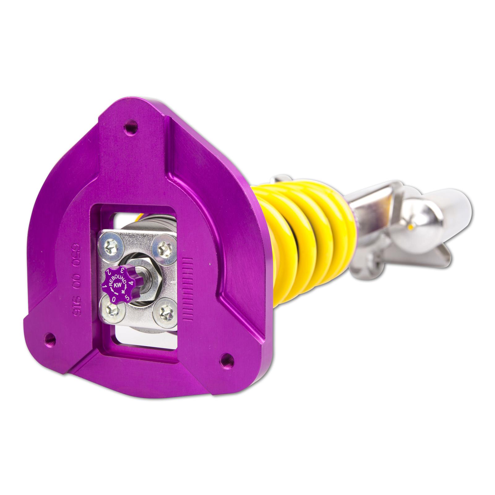 Neben optional erhältlichen einstellbaren Stützlagern können Sie bei den KW Clubsport Gewindefahrwerken die Dämpferkräfte unabhängig in der Zug- und Druckstufe mit den integrierten Einstellrädchen anpassen.
