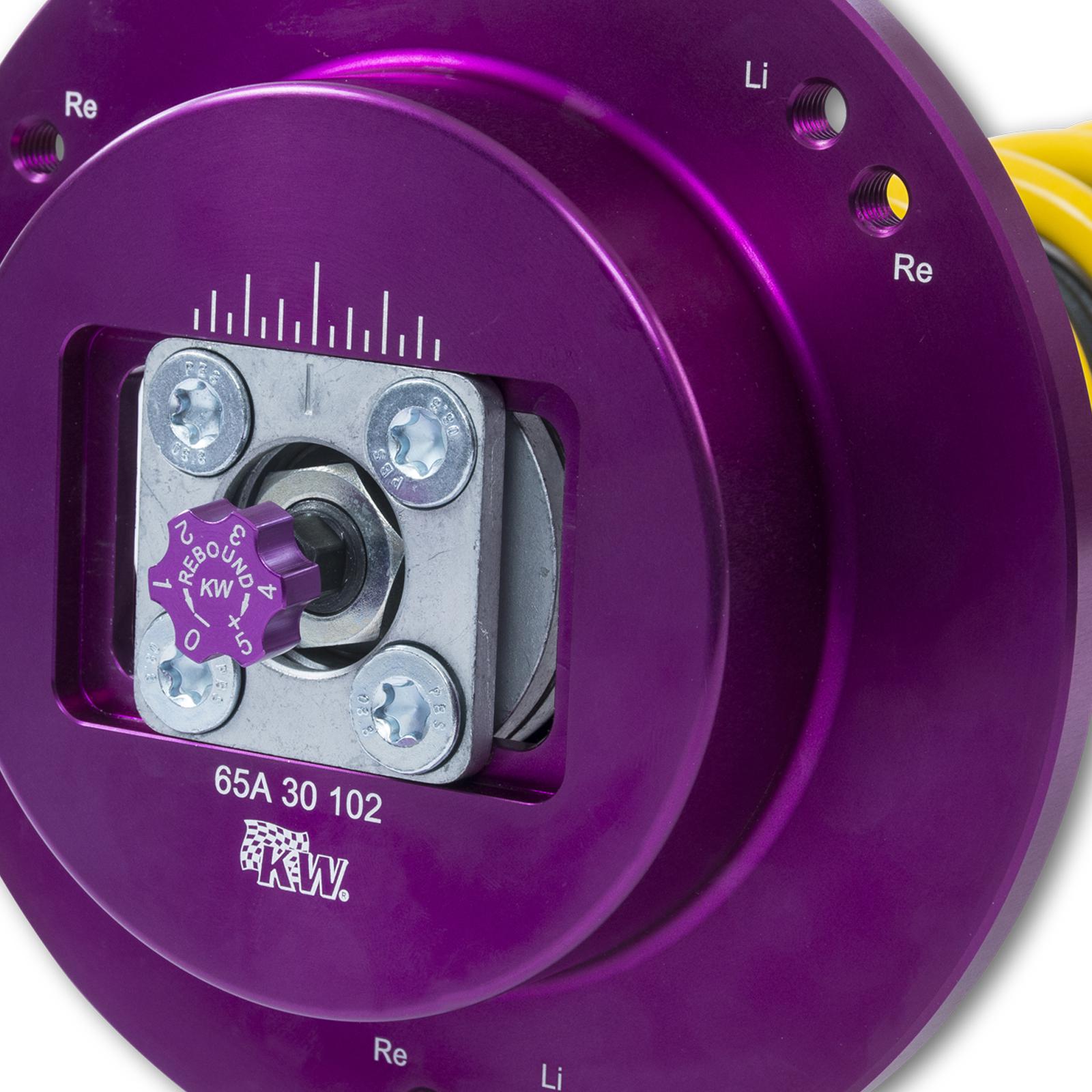 Neben optional erhältlichen einstellbaren Stützlagern können Sie bei den KW Clubsport Gewindefahrwerken die Dämpferkräfte unabhängig in der Zug- und Druckstufe mit den integrierten Einstellrädchen anpassen.