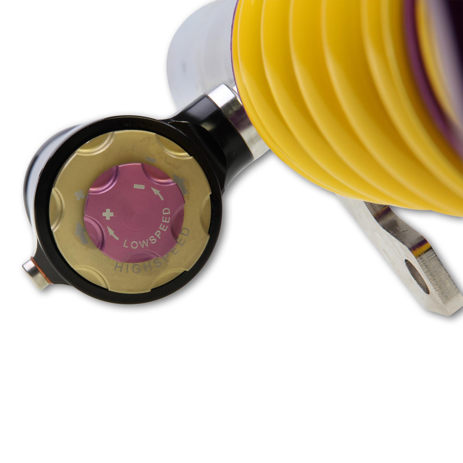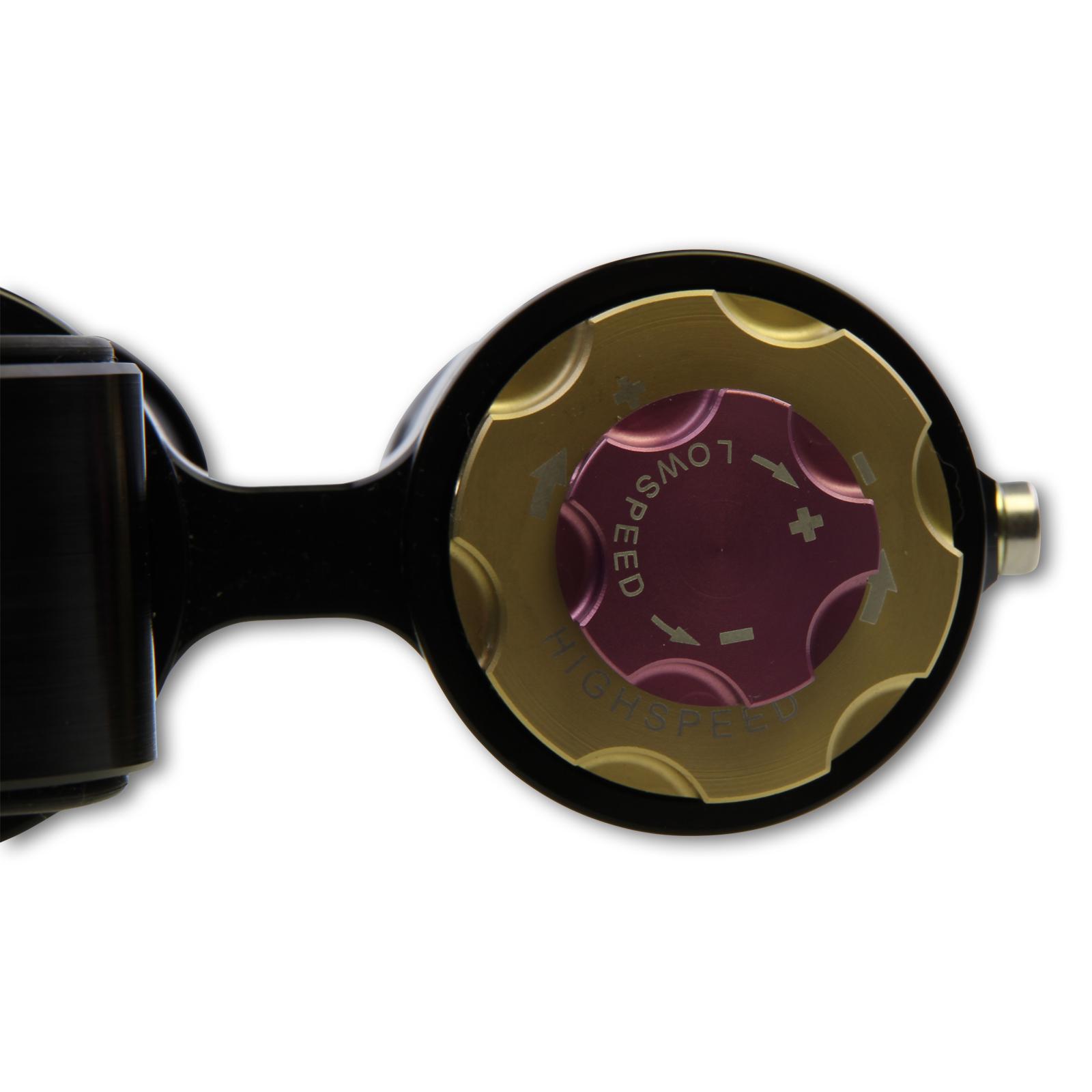 Die Verstellung erfolgt direkt am Produkt und völlig intuitiv mithilfe der markanten lilafarbenen und goldenen Einstellrädchen direkt am Ausgleichsbehälter. Dadurch passt du das Dämpfersetup ideal auf die Radlasten, das Gewicht und eine womöglich geänderte Karosseriesteifigkeit (z.B. durch verschraubte Käfige, Zellen) an.